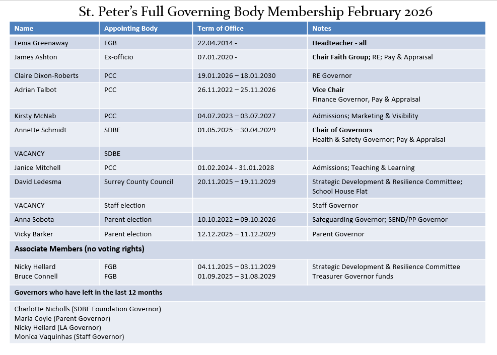 Governors have a strategic role in the School leadership and accountability. At St Peter’s School the Governors strive to ensure that each child is safe, happy and has every opportunity to reach their full potential.